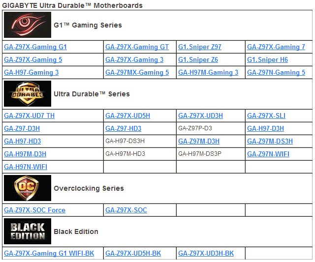 Список устройств выглядит следующим образом, как можно понять, изделия основаны как на Z97, популярном решении для геймеров и энтузиастов, так и на H97, упрощённом варианте чипсета Z97: