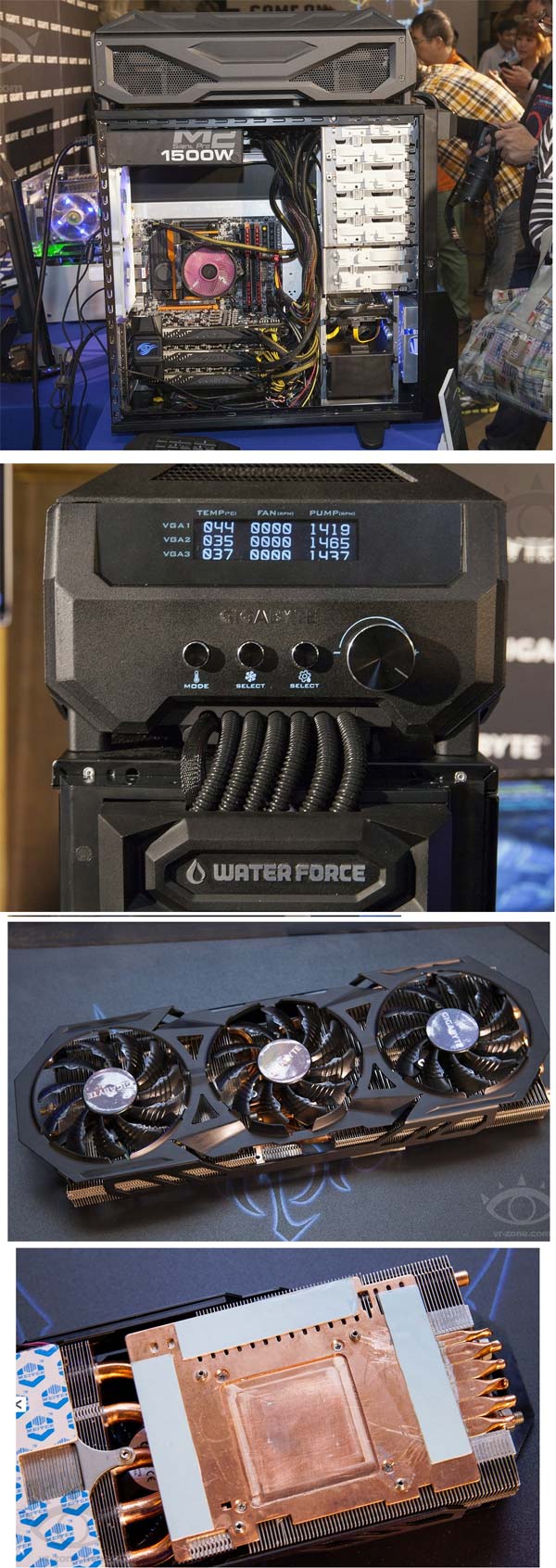 Изделие позволяет мониторить температуру графических ядер видеокарт, скорость вращения лопастей вентиляторов и скорость работы помпы. На видеокартах, само-собой, установлены Full-cover водоблоки, охлаждающие не только GPU, но и VRM с памятью. Помимо этой монструозной системы охлаждения компания Gigabyte также показала кулер WindForce 600W, созданный для усмирения пыла GeForce GTX TITAN Black.
