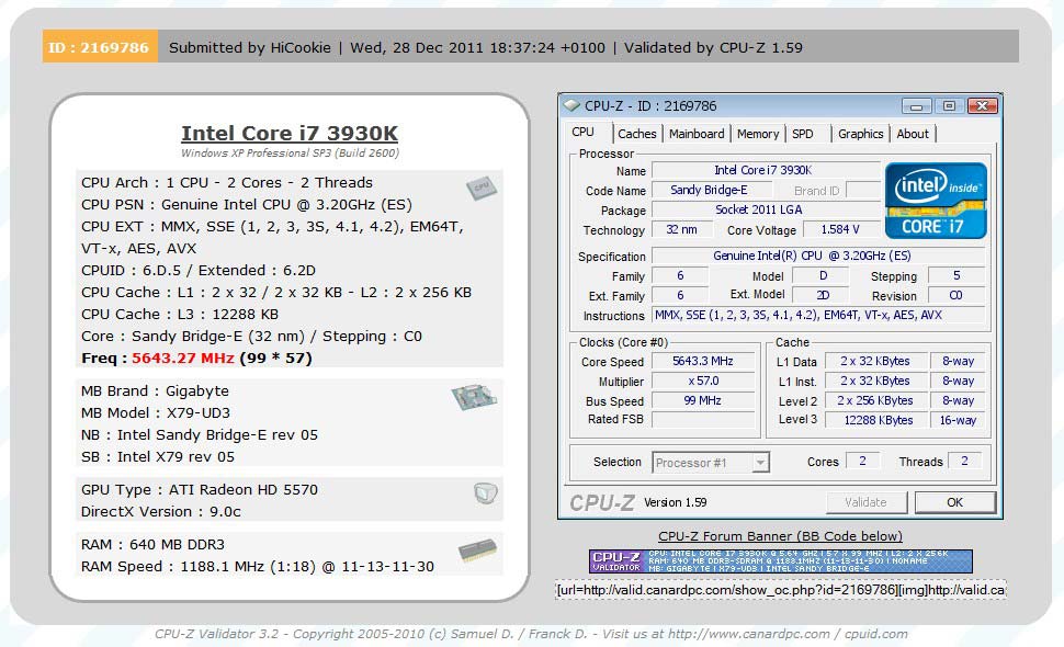 HiCookie удалось погнать процессор Core i7-3930K до частоты 5643.2МГц при напряжении 1.584 вольт и множителе 57х. Используемая системная плата - X79-UD3 с BIOS F7, блок питания - Corsair AX1200W, оперативная память - Kingston HyperX Genesis. В качестве доказательства, что разгон более-менее стабильный, HiCookie прогнал "камушек" через бенчмарки Super Pi 1M, 32M и PiFast, заодно и поставив рекорд в этом деле (посмотреть достижения тайваньского оверклокера можно на HWBot).