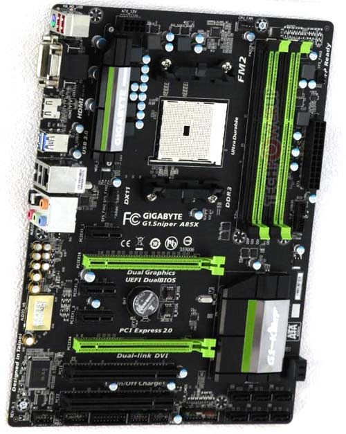 Изделие G1.Sniper A85X ориентировано на успешную совместную работу с APU Richland, оборудовано сокетом FM2, построена на базе чипсета A85X. Форм-фактор новинки самый распространённый - ATX, эта плата питается от связки из 24-х пинового ATX и 8-пинового EPS коннекторов питания, имеет 6-фазовое питание APU.