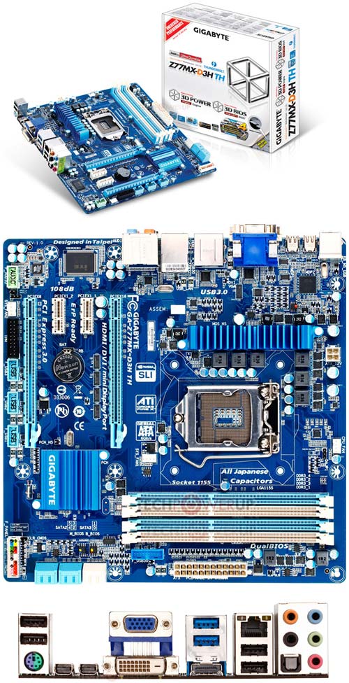 Шутки-шутками, но пора и к делу приступить. Итак, компания Gigabyte предлагает материнскую плату Z77MX-D3H-TH, что ориентирована на рынок производительных домашних компьютеров. Базируется изделие на Z77 Express, дружит с процессорами Core второго и третьего поколений - тех, что с сокетом LGA1155.