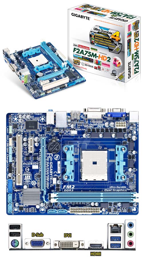 Новинка называется GA-F2A75M-HD2, имеет форм-фактор MicroATX (225x174мм), основана на чипсете AMD A75. Плата поддерживает как APU Trinity, так и процессоры Athlon с сокетом FM2. У неё два слота для оперативной памяти DDR3, один слот PCI Express x16, один PCI Express x1, да ровно такое же количество PCI.