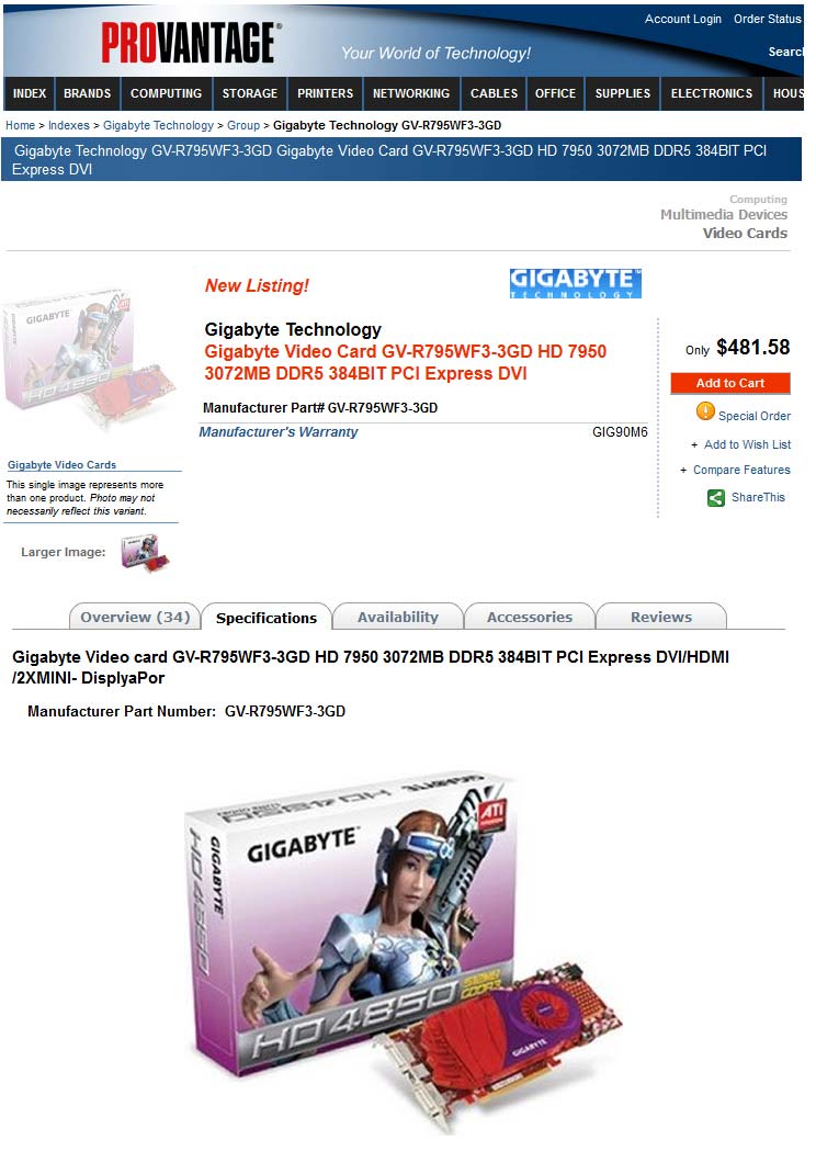 Как видно по скриншоту выше, владельцы магазина не предоставили на обозрение реальной фотографии Gigabyte Radeon HD 7950, а ограничились фото относительно древней HD 4850. Это говорит о двух вещах - или у компании нет разрешения размещать фотографии имеющейся на руках видеокарты, или же видеокарты у них нет.