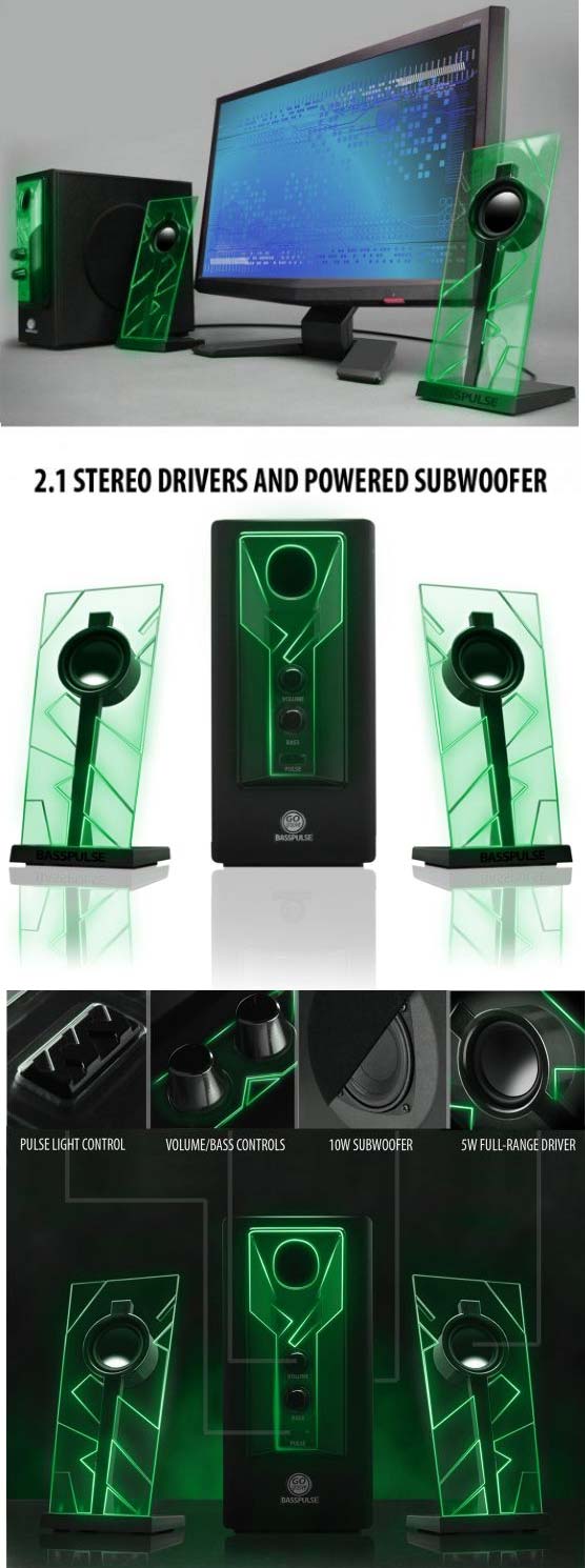 Мощность колонок BassPULSE 2.1 составляет 10 ватт (2x5 ватт), пиковая мощность - 40 ватт, используются 40мм драйверы и 101мм вуфер. Импеданс 4 Ом у драйверов и 6 Ом у вуфера, чувствительность - 90 дБ, диапазон воспроизводимых частот - 80Гц-20кГц. Размеры сателлитов составляют 8.25x3.5x3", размеры вуфера: 11x9.25x4.5", вес равен 6 фунтам.