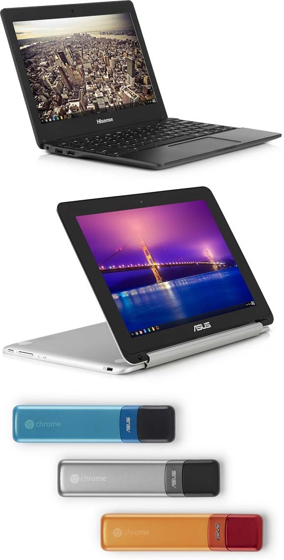 На фото выше также показан Chromebit, представляющий собой ~полноценный компьютер размером с флешку, подробнее об устройстве нам расскажут летом, использоваться такие агрегаты должны в сфере образования. Девайсы стоят от 149 до 249 долларов США.