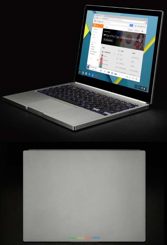 Аппарат именуется Chromebook Pixel, его размеры составляют 297.7x224.55x15.3мм, вес равен 1.5КГ. Сенсорный экран у новинки имеет диагональ 12.85", соотношение сторон 3:2, разрешение - 2560x1700, углы обзора - 178 градусов, яркость - 400 нит. Конфигураций представлено две - с процессором Core i5 (Broadwell в обоих случаях) @ 2.2ГГц и 8ГБ оперативной памяти, а также Core i7 @ 2.4ГГц и 16ГБ "оперативки".