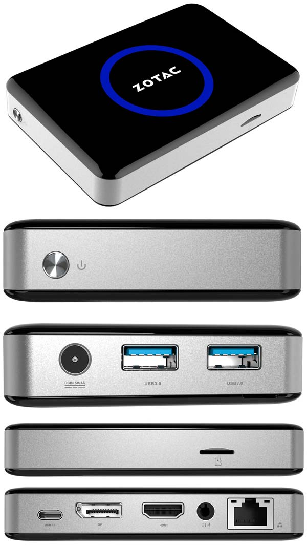 Устройство обладает одним портом USB 3.0 Type-C, двумя USB 3.0, видеовыходами HDMI и DisplayPort, комбинированным 3.5мм аудио-портом (для наушников и микрофона), гигабитным Ethernet портом. Кнопки Reset на шасси не видно, но точно есть кнопка Power. Продукт Zotac имеет некое VESA крепление, так что при желании его можно будет повесить за монитором.
