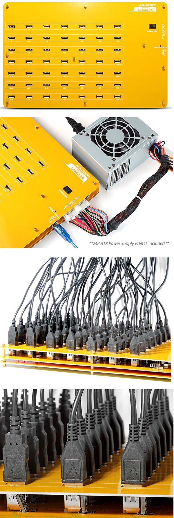 Люди часто удивляются, когда видят USB хабы с 10 и более портами, представляю что с ними было бы, если бы они узрели 49 портов нового USB концентратора UHUBS041500. Аппарат огромен, его габариты составляют 350x231x38мм, вес равен 1050 граммам. Чтобы обеспечить такую махину питанием, требуется отдельный БП и подключение по 24-пиновому коннектору, да - совсем как системная плата ПК.