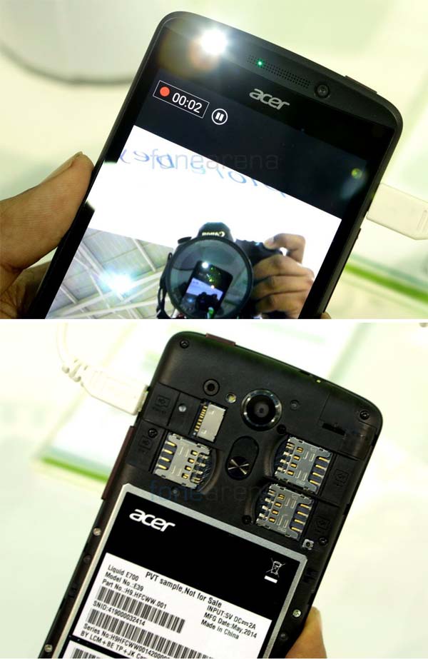 Управление новинкой в лице Liquid E700 легло на плечи Android 4.4, количество слотов для SIM карт равно трём, что впечатляет и несколько обескураживает. Тыловая камера имеет автофокус, 8МП сенсор и LED вспышку, а фронтальная - 2МП сенсор. Толщина корпуса изделия - 9.9мм, вес равен 155 граммам, питается продукт Acer от батареи на 3500 мАч. Не обошлось и без поддержки 3G HSPA+, 802.11 b/g/n WiFi, Bluetooth 4.0 и GPS.