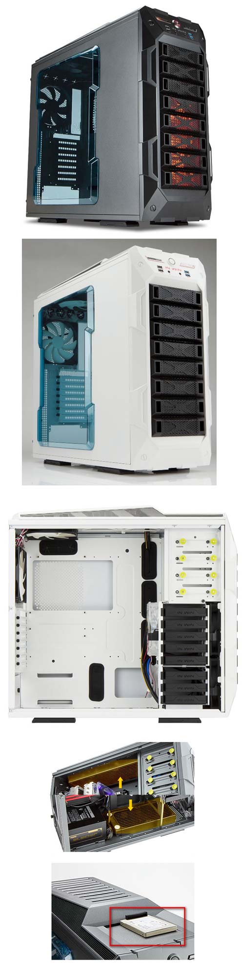 У корпуса BX141 три 5.25" отсека, восемь мест под 3.5 и 2.5" накопители, всё это добро можно разместить в двух отсоединяемых корзинах (а раз корзины отсоединяются, то видеокарты в корпус производства In Win влезут любой длины). Охлаждением компонентов внутри корпуса занимаются два 140мм вентилятора с LED подсветкой, что находятся во фронтальной части изделия. Накопители также обдувает 140мм вентилятор, но без подсветки, плюс такой же трудится на задней стенке устройства, да ещё и 120мм "вертушка" работает на верхней стенке.