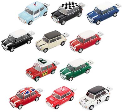Стоит отметить, что и раньше Green House по лицензии BMW выпускали флешки в виде автомобилей Mini Cooper, но то были 4ГБ изделия, а сейчас нам демонстрируют "машинки" ёмкостью 8ГБ. Всего представлено 11 моделей флешек серии Mini Cooper USB memory, рассмотреть их можно на фото ниже.