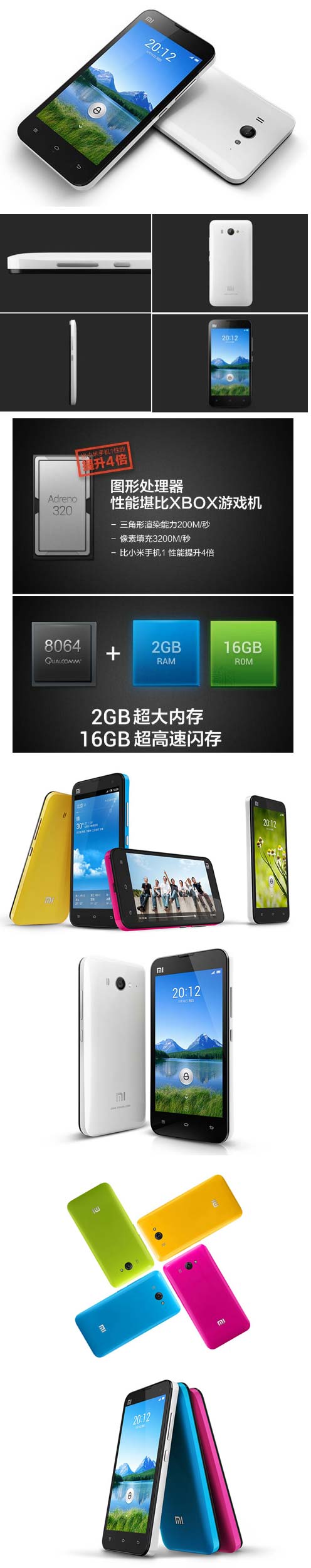 Изделие Mi-Two является логичным продолжением Mi-One, но работать будет не в пример шустрее. Это не удивительно при такой-то "начинке": четырёхъядерный чип 1.5ГГц Snapdragon S4 Pro с графическим ядром Adreno 320 (APQ8064), 2ГБ оперативной памяти LPDDR2 и 16ГБ места на накопителе, батарея на 2000 мАч (будет вариант и с 3000 мАч батареей), 8МП задняя и 2МП фронтальная камеры.