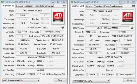 Скриншоты с характеристиками Radeon HD 6570 и 6670 (Turks)