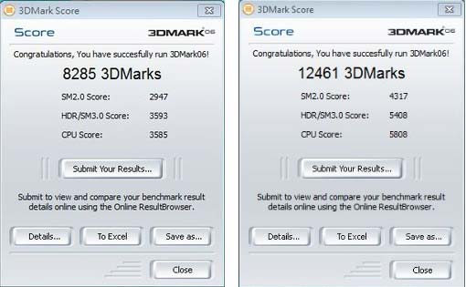 А вот как выступили карточки в 3DMark 06, полный конфиг ПК неизвестен, однако с 6570 в паре выступал процессор Intel Core i3 560, а с 6670 - Phenom II X6 1100T.