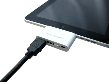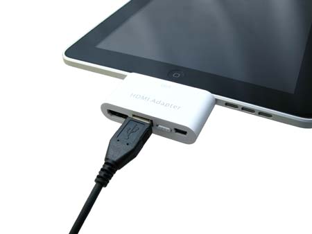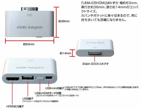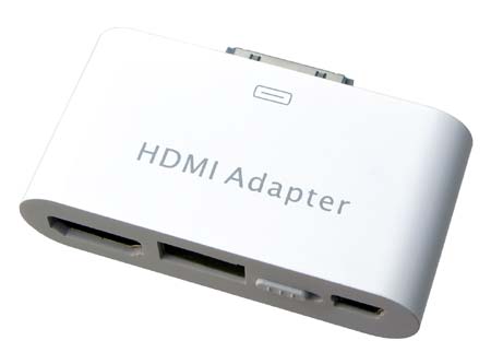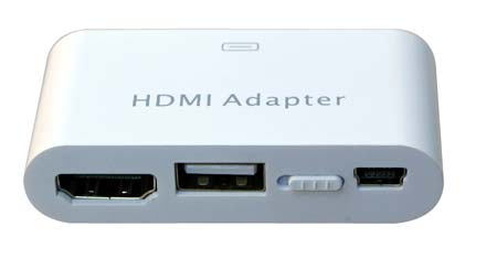 Впрочем, если разобраться, то становится более-менее понятен функционал устройства. UMA-iOSHDMI подключается в iPad / iPhone4 / iPod Touch и позволяет вывести изображение с дисплея "яблочных" девайсов на экран какого-нибудь телевизора или монитора по HDMI. Также, это самое изобретение Hanwha даёт возможность подключить к любимому планшетнику/смартфону/медиа-плееру какое-либо устройство по USB (например совместимую с Mass Storage камеру или флешку).