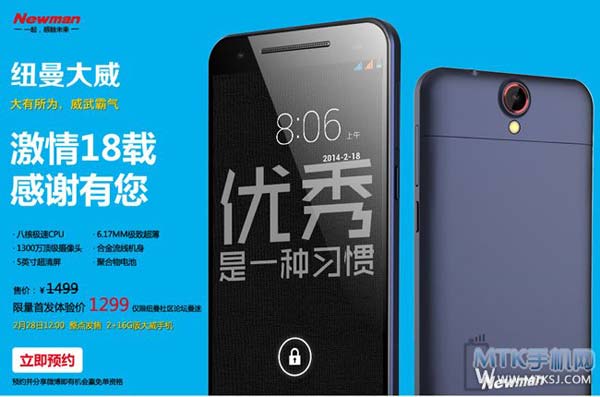 Смартфон Newman K18 основан на новой, но уже хорошо известной и очень популярной среди китайских производителей восьмиядерной 1.7ГГц SoC MT6592 от компании MediaTek. Оперативной памяти у изделия 2ГБ, места для файлов пользователя - 16 или же 32ГБ, т.е. доступно два варианта умного телефона.