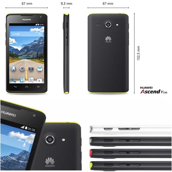 Размеры умного телефона составляют 132.5x67x9.3мм, вес равен 145 граммам. Ascend Y530 поддерживает 802.11 b/g/n WiFi, HSDPA и Bluetooth 4.0. Смартфон имеет слот для карточек microSD/SDHC, питается от батареи на 1750 мАч, имеет 5МП тыловую и 0.3МП фронтальную камеру. Доступные цвета устройства: чёрный с серым, чёрный с красным, чёрный с жёлтым и белый с серым.