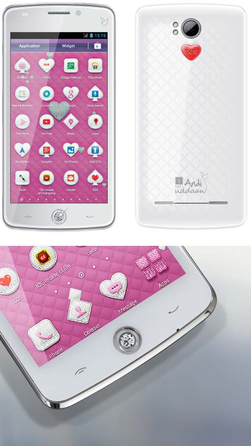 Что делает аппарат Andi Uddaan чисто женским? Разумеется дизайн - как внешний, так и внутренний (имеется в виду оболочка ОС). Новинка украшена так называемыми кристаллами Сваровски, цвет корпуса аппарата - белый или же розовый. Изделие обладает 5" IPS сенсорным экраном ёмкостного типа с разрешением 960X540, показатель плотности пикселей изделия - 200 PPI.