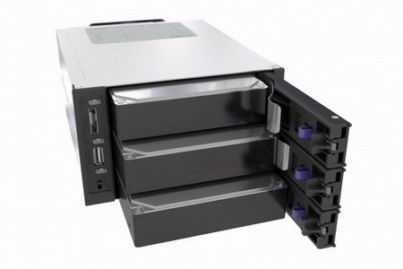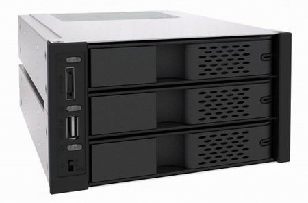 Итак, перед нами корзина для трёх 3.5" винчестеров, она устанавливается в 5.25" слот, причём занимает сразу два из них. Габариты новинки 210х148х85мм, на её корпусе присутствуют USB и eSATA разъёмы. Чтобы винчестеры в работе не перегрелись (шутка ли - три 3.5" почти вплотную один к другому) их обдувает сзади 80мм вентилятор. Установка этой корзины в корпус осуществляется в режиме Tools-Free (без инструментов). Винчестеры можно менять без напряга, т.к. поддерживается их "горячая" замена.