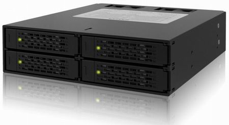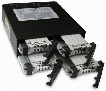 Именно для таких целей компания Icy Dock выпустила MB994SP-4S, устройство, позволяющее в отсек для 5.25 дюймовых девайсов засунуть аж четыре 2.5 дюймовых. Благодаря используемой системе EZ Slide Mini Tray в любой момент можно достать запрятанный внутри этой корзины накопитель (мало ли - взбрело в голову их почистить). Охлаждаются накопители внутри творения Icy Dock двумя 40мм вентиляторами, надеюсь, что не очень шумными.