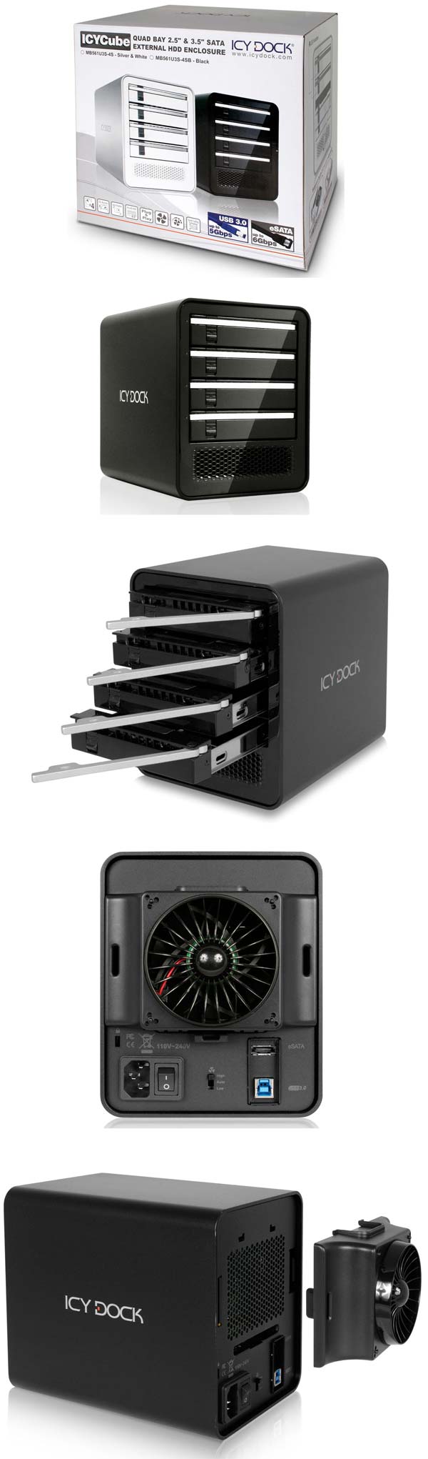 Аппарат именуется ICYCube MB561U3S-4SB, представляет собой контейнер для четырёх SATA накопителей, подключаемый по USB 3.0 или же eSATA. С новинкой совместимы как 2.5" накопители, так и 3.5", винчестеры и SSD. Питается аппарат от электросети, охлаждение винчестеров осуществляется посредством одного 80x80x25мм вентилятора, скорость которого можно регулировать (высокая, низкая и автоматический режим).