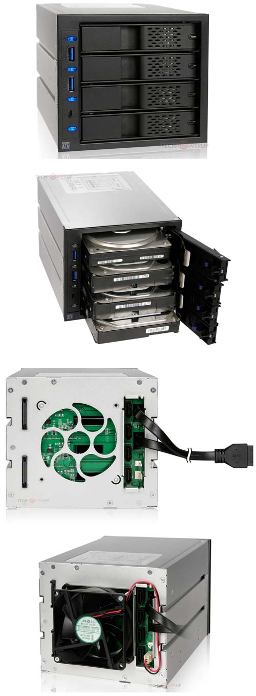 Корзина сделана из сплава алюминия, на который также передаётся часть тепла от работающих внутри FlexCage MB974SP-2B накопителей. Для удобства пользователя, новинку оснастили USB 3.0 хабом, расположенным в фронтальной части устройства. Комплектный вентилятор можно заменить на любой другой нужного размера (2-х или же 3-х пиновый).