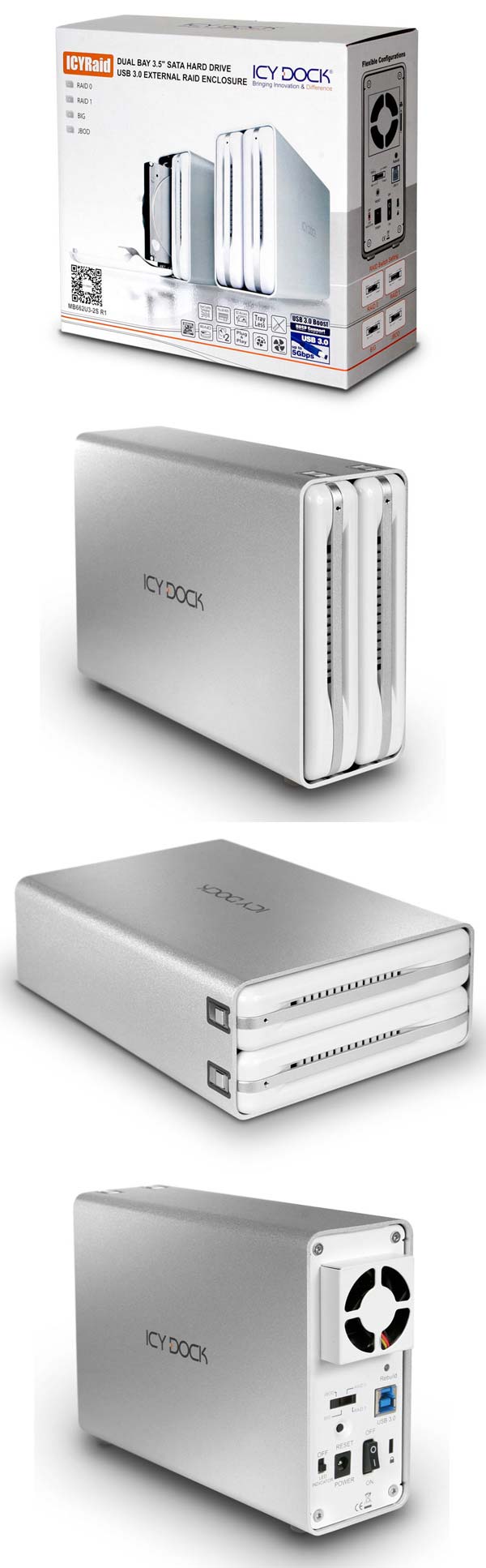 Изделие именуется ICYRaid MB662U3-2S R1, представляет собой внешнее шасси, в которое помещается два SATA (1-3 поколений) 3.5" накопителя до 8ТБ ёмкостью каждый. Благодаря наличию встроенного RAID контроллера, устройство поддерживает создание массивов RAID 0, 1, JBOD и BIG.