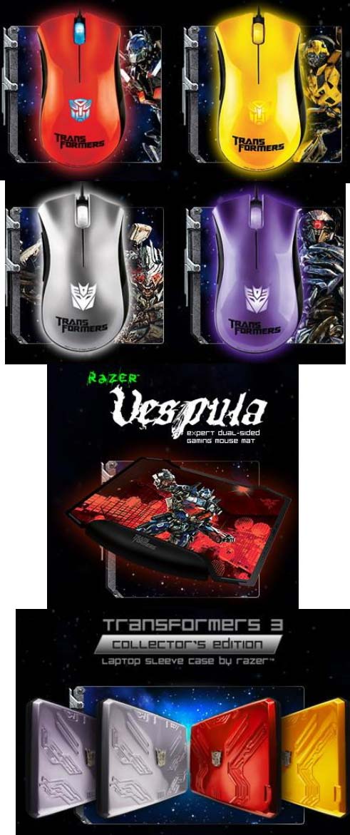 Как известно, Razer является одной из тех компаний, которые не могут не "навариться" на фанах того или иного блокбастера, будь то игра или кино/мультфильм. Так что нет ничего удивительного в том, что на скорую руку были адаптированы некоторые из успевших себя зарекомендовать устройств её ("Рэйзер") производства под бренд Transformers 3. Для нас выкатили кастомизированные мышки DeathAdder (четыре варианта), двусторонние коврики для мыши Vespula (два варианта) и переносные сумки для лэптопов (четыре варианта).