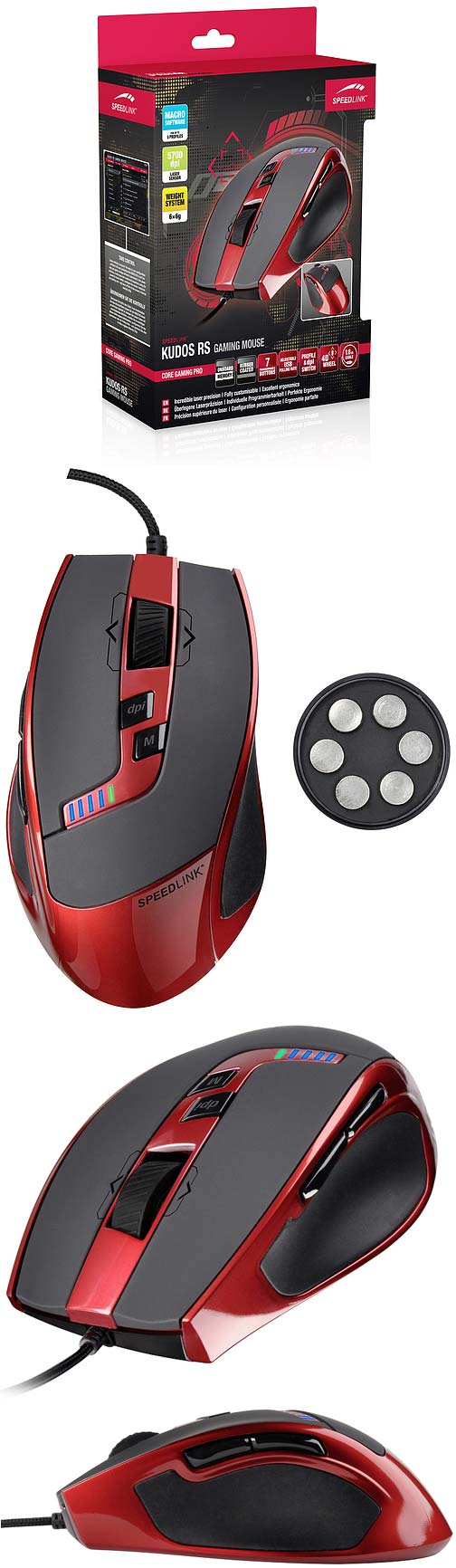 Вообще мышей у Speedlink в ассортименте полно, но вот именно геймерских я насчитал всего три - STYX, PRIME и вот теперь KUDOS RS. Все эти мыши проводные, самая последняя новинка может похвастаться лазерным сенсором, разрешение которого можно регулировать с 90 до 5700 точек на дюйм, при этом чувствительность можно менять отдельно для оси X и оси Y. Частота опроса сенсора составляет 1000Гц, скорость мыши - 150 дюймов в секунду.