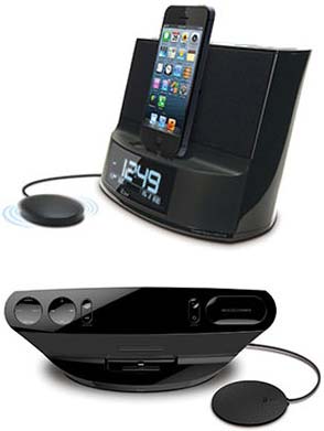 TimeShaker представляет собой док-станцию для новых вариантов iPhone и iPod, тех, что оснащены коннектором Lightning. Чем продукт от iLuv отличается от прочих подобных ему агрегатов? Тем, что функция будильника осуществляется как традиционно - с помощью активации в определённое время музыки с iPhone/iPod или включения FM радио, так и с помощью проводного вибрирующего устройства.