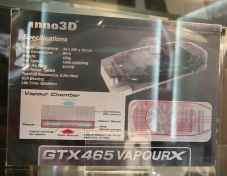 Нереференсные модели GTX465 доступны, как известно, с первого дня продаж этой видеокарты и только ленивый не успел засветится с собственной версией этого крайне сомнительного продукта. Инно3Д не особо размышляя решила прилепить в GTX465 испарительную камеру