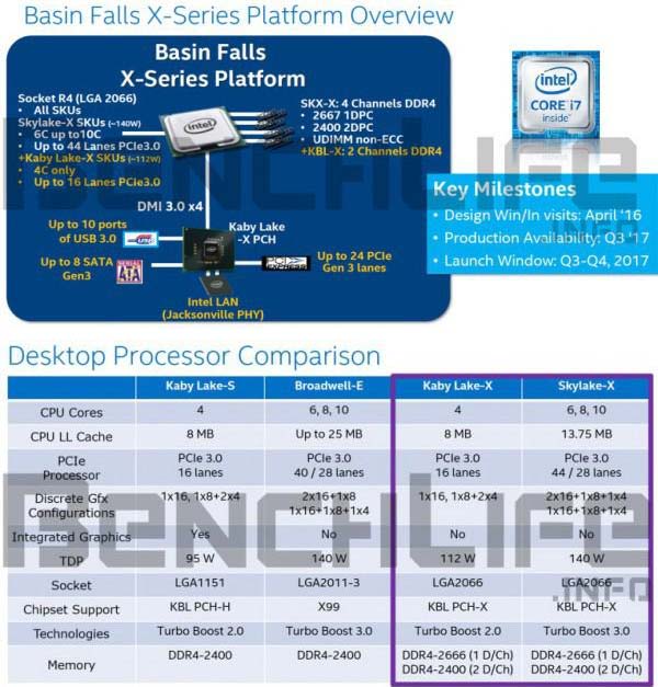 Решения будут называться Skylake-X и Kaby Lake-X, специально для них (и тех, кто последует за ними) разработан сокет LGA 2066 (Socker R4), цифра традиционно показывает количество штырьков в сокете. В семействе Skylake-X будут 6-и, 8-и и 10-и ядерные процессоры с TDP по 140 ватт включительно, иными словами - перед нами наследник Broadwell-E. А Kaby Lake-X станет продолжателем дел Kaby Lake-S, количество ядер тут ограничено четырьмя, поддержки Turbo Boost 3.0 нет, линий PCIe меньше, каналов памяти два.