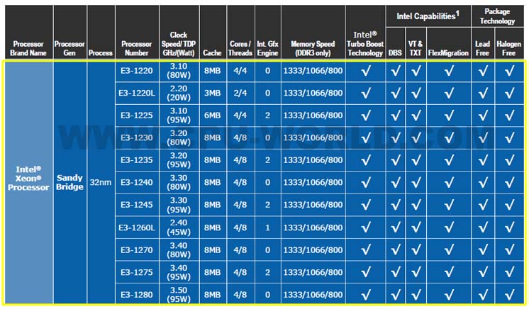 Благодаря коллегам с сайта Cpu World у нас появилась возможность узнать спецификации всей линейки Xeon E3-1200, вот табличка: