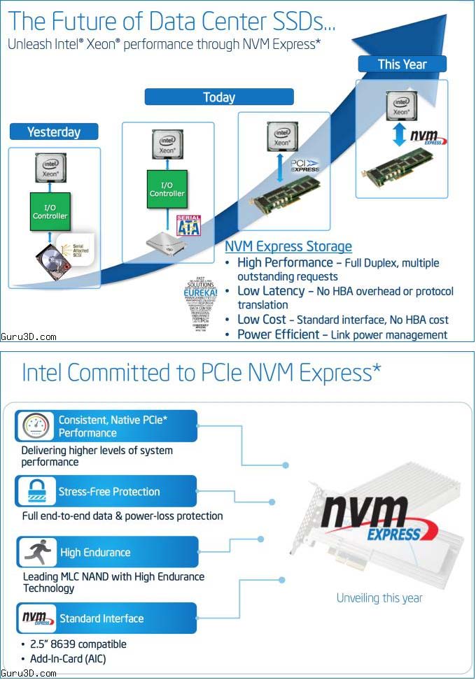 Нам сообщают, что PCIe продукты NVM Express (Non-Volatile Memory Host Controller Interface Specification) будут просто монстрами в плане производительности. Сложно представить скорость передачи данных в районе 3000МБ/с, ещё сложнее осмыслить, что показатель IOPS у накопителя может быть равным 750000 (для сравнения - у лучших представителей домашних SSD форм-фактора 2.5" этот показатель равен ~95000). Есть сведения, что новинки от Intel для серверного сегмента рынка сначала появятся в PCIe исполнении, а затем и в виде 2.5" накопителей, подключаемых по SATA Express через коннектор SFF-8639.