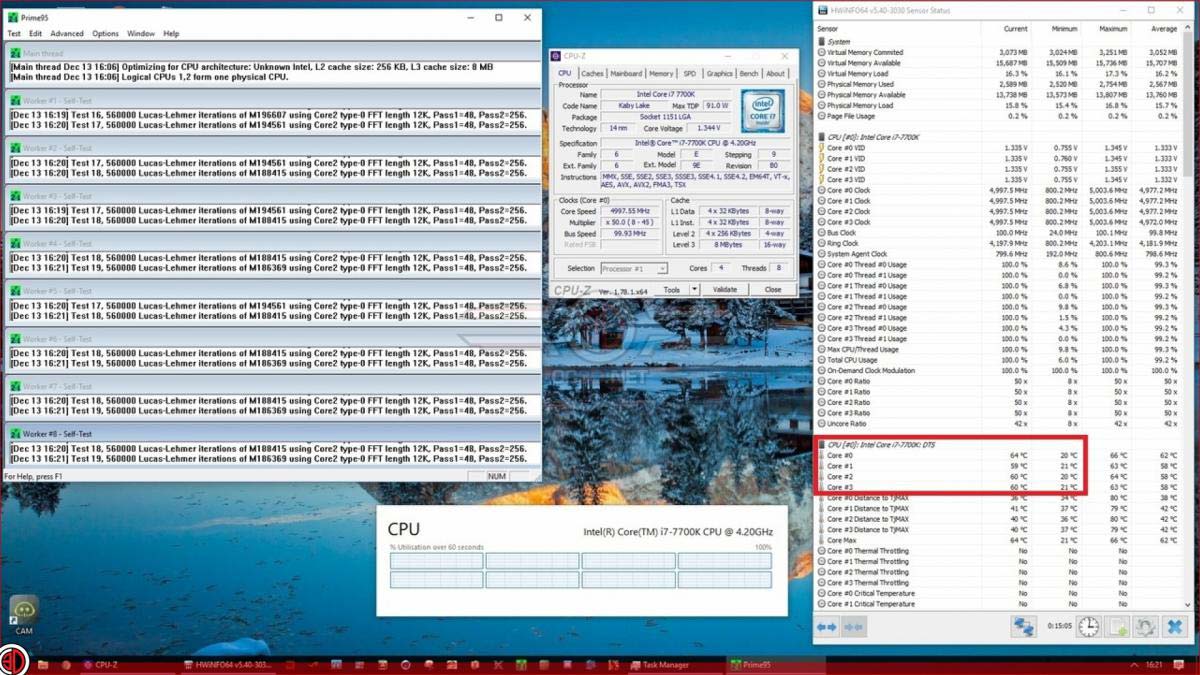 Тот же ресурс опубликовал результаты исследований, проведённых английским оверклокером RichUK. Этот деятель разогнал процессор Core i7-7700K до 5ГГц, используя повышение напряжения на ядре до 1.344 вольт и применяя СВО NZXT Kraken 62. Не модифицированный процессор в таком режиме прогревался под Prime95 до 90+ градусов по Цельсию, вот скриншот: