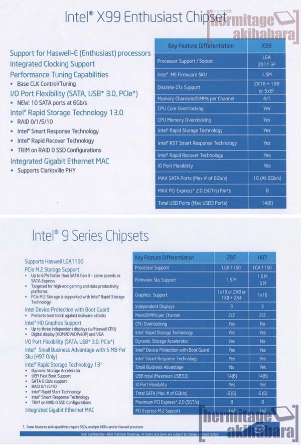 Ресурс Hermitage Akihabara поделился сведениями о возможностях системных плат нового поколения, использующих чипсеты Z97, H97 и X99 (9-я серия).