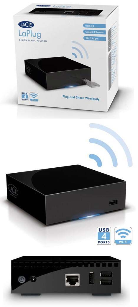 LaPlug представляет из себя небольшую коробочку (выглядящую чрезвычайно стильно), к которой можно подключить какие-угодно накопители с интерфейсом USB 2.0, после чего по 802.11 b/g/n WiFi или же проводной сети смотреть медийные файлы с подсоединённых винчестеров/SSD и флешек