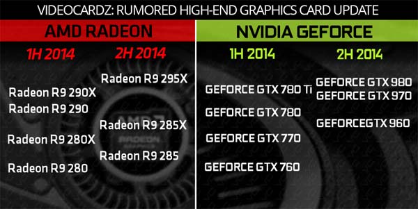 Как видно по картинке выше, AMD не сидит без дела и планирует выпустить R9 295X, однако сделает это она лишь после того, как оценит способности продуктов конкурентов. GTX 960 будет выпущен Nvidia в октябре, по крайней мере есть такие данные. Ну что же - с нетерпением ждём подвергшихся внезапному переименованию решений.