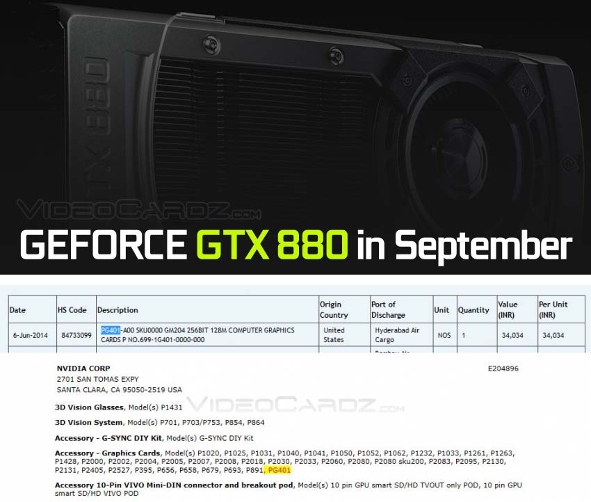 Релиз новинки в лице GeForce GTX 880 состоится в первом месяце осени, причём сначала будет так называемое бумажное представление аппарата, а доступность в продаже обещают к концу месяца. Информация основана на том факте, что карта отправлена на сертификацию, а в цикле производства графического адаптера эта стадия является последней, после чего уже идёт представление изделия публике и релиз. В документе под фото ниже выделена позиция PG401, которая является референсной платой для карты с чипом GM204-400, а быть это может только GTX 880.
