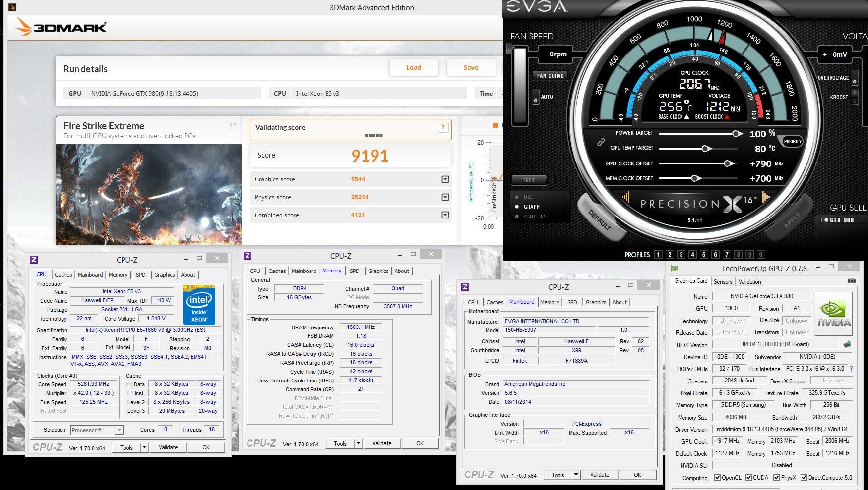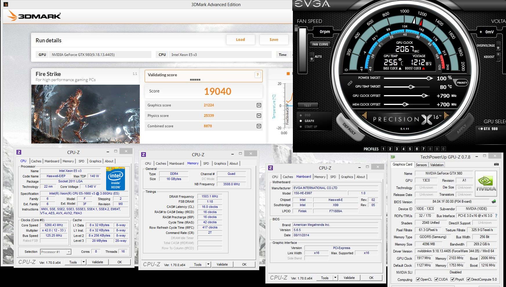 Этими оверклокерами стали K|NGP|N и TiN, им удалось заставить видеокарту EVGA GeForce GTX 980 работать на тактовой частоте 2050МГц. В составе платформы для бенчмаркинга трудилась системная плата EVGA X99 FTW, блок питания на 1600 ватт тоже от EVGA, процессор Xeon E5 v3, 16ГБ оперативной памяти DDR4 (3000МГц, тайминги 16-16-16-42), работающей в 4-канальном режиме.