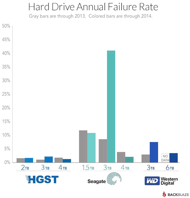 Цифры, открытые компанией, весьма устрашающие - из строя лишь за 2014 год вышло 40% купленных винчестеров Seagate Barracuda 7200.14 3ТБ. Я не на секунду не сомневаюсь в истинности данных, ибо недавно сам прикупил такой накопитель и обнаружил на нём 9000+ Bad секторов, подробнее читайте тут.