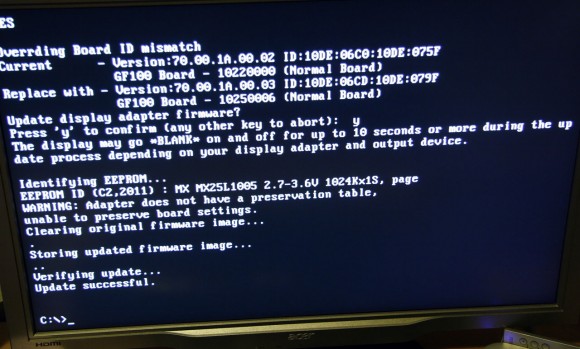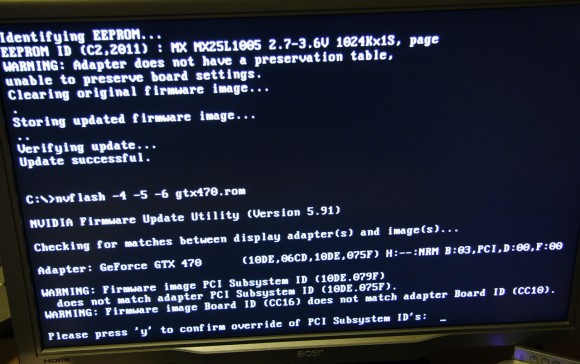 4.Теперь пришла пора залить в наш GTX465 биос от GTX470. Важно понимать, что во время этого процесса Вы (или кто другой) ни в коем случае не должны отключать питания ПК или перезагружать его (это чревато негативными последствиями для карты). Чтобы начать прошивку напечатайте nvflash -4 -5 -6 gtx470.rom