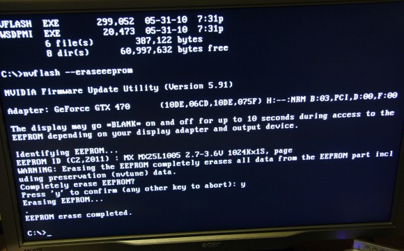 3.Теперь следует удалить EEPROM видеокарты, для этого используйте следующую команду - nvflash-eraseeeprom, когда программа потребует подтверждения нажмите кнопку "Y" на клавиатуре.