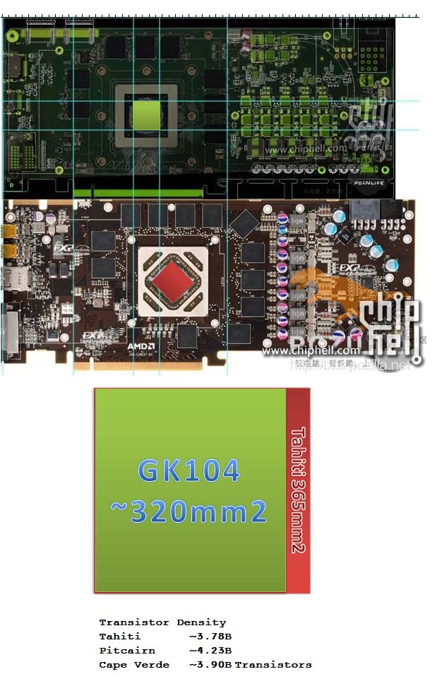 Как видно, площадь графического чипа решения на базе GK104 составляет 320мм², что примерно на 45мм² меньше площади графического чипа Tahiti, используемого в HD 7950/HD 7970. Также, на слайде выше даны сведения, касаемо плотности размещения транзисторов в графическом ядре. Разумеется, данных о GK104 там нет, а потому все они нам не особо важны (да и известны давно).