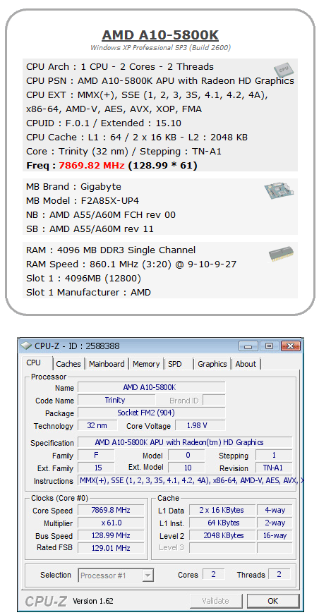 Охлаждение APU производилось жидким азотом, температура на "камне" была минус 190 градусов по Цельсию. Помимо упомянутой системой платы и A10-5800K в компьютере трудилась видеокарта Radeon HD 7770, а также 4ГБ оперативной памяти DDR3, функционировавшей на тактовой частоте 860.1МГц (3:20) @ 9-10-9-27. Два ядра у A10-5800K для разгона были отключены, напряжение на APU подавалось в 1.98 вольт.