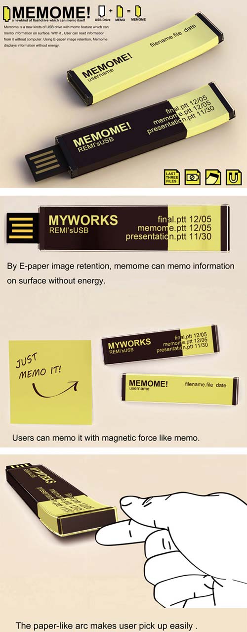 На этот раз нам показывают интересный концепт - гибриде флешки с напоминалками (это такие листочки жёлтые с липкой основой в верхней части, которые люди прилепляют на видное место, чтобы не забыть нечто важное для себя). Реализовано это так - на корпусе флешки имеется e-ink дисплей, который показывает различные надписи, в том числе сообщения, которые владелец флешки оставил сам для себя.