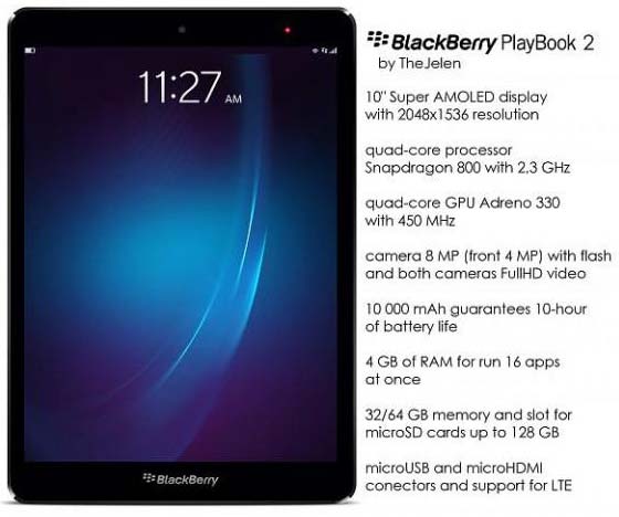Данные о концепте PlayBook 2 появились от The Jelen. Изделие имеет 10.1" Super AMOLED экран с разрешением 2048x1536, именно тачскрин является самой интересной частью аппарата. Основой планшетника стала популярная в устройствах ТОП уровня прошлого года SoC Snapdragon 800 от Qualcomm, SoC работает на тактовой частоте 2.3ГГц, обладает графикой Adreno 330 (450МГц).