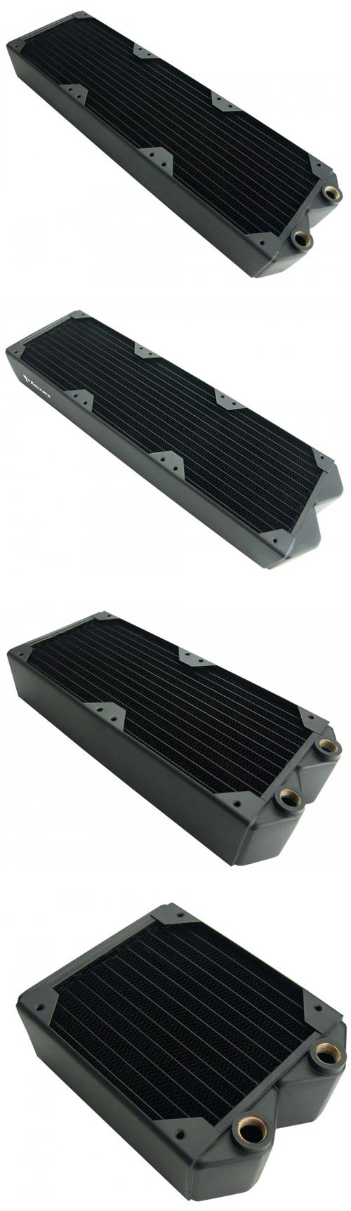 Изделия называются HX-120XC, HX-240XC и HX-360XC, они 120мм, 240мм и 360мм, т.е. рассчитаны на один, два и три 120мм вентилятора, как можно понять. Толщина изделий составляет 54мм, сделаны радиаторы из меди, показатель плотности пластин на дюйм составляет 30 FPI. Новинки рассчитаны на работу с высокопроизводительными вентиляторами в конфигурации push-pull.