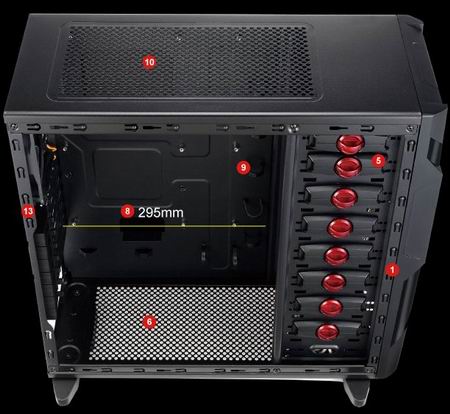 На вид обычный корпус размера Mid-Tower с габаритами 430x19x493мм, вес - 4.7 килограмм. Изготовлен из японской стали толщиной 0.6мм, имеет большое количество 5.25 дюймовых отсеков, поддержку одного 2.5 дюймового SSD носители (конечно подключить их можно сколько угодно, но вот в корпусе предусмотрено всего 1 крепление), для поклонников систем жидкостного охлаждения просверлены соответствующие отверстия под шланги СВО. На выдув работает вентилятор типоразмера 120мм (1500 оборотов скорость вращения крыльчатки - на мой взгляд многовато).