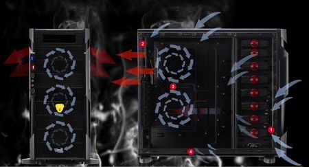 Всего в корпус можно установить до семи 120мм вентиляторов, на слайде снизу видно как будет циркулировать воздух внутри шасси: